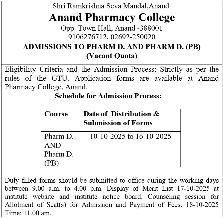 ADMISSIONS TO PHARM D. AND PHARM D. (PB) (Vacant Quota)