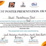 Congratulations to Shachi Patel, M.Pharm Pharmaceutics Scholar, for securing Third Place in the Poster Presentation at the National Symposium on “Cutting-edge Developments in Nanobiotechnology and Nanomedicine” held on December 20, 2024, at Dharmsinh Desai University, Nadiad. The event was sponsored by Gujarat State Biotechnology Mission, DST, Govt. of Gujarat,